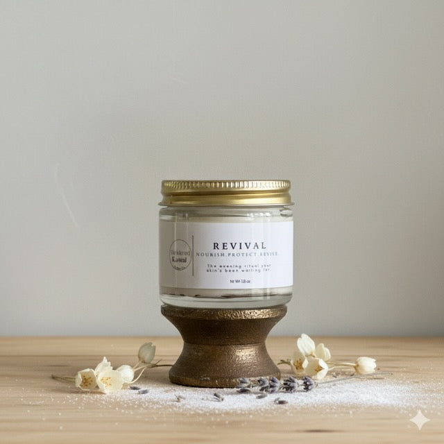Revival is your evening ritual in a jar — a deeply restorative whipped tallow balm designed to wrap your skin in nourishment while you rest. The texture is soft and airy, melting in effortlessly and leaving your skin feeling calm, hydrated, and cared for by morning.